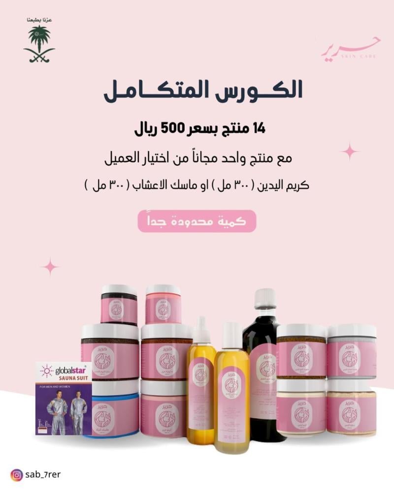احصلي على تجربة عناية فاخرة ببشرتك من خلال مجموعة العناية بالجسم الكورس الكامل، التي تضم منتجات متكاملة لتفتيح، ترطيب، وتجديد البشرة. تم تصميم هذه المجموعة بعناية لتمنحك بشرة ناعمة، مشرقة، وصحية من الرأس إلى القدمين.